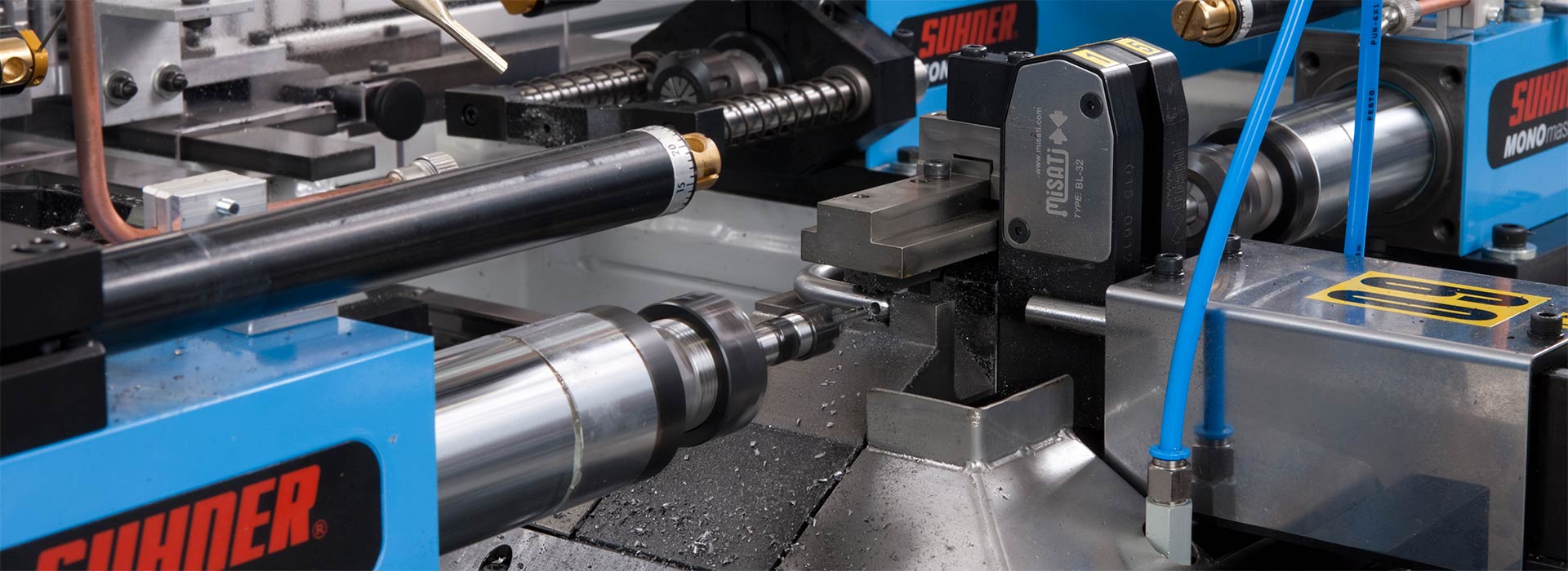 - Eingebauter Vorschub mit Ölbremszylinder: Die gleichmäßige und kontrollierte Vorschubbewegung führt zu einer präzisen Materialbearbeitung. Der Ölbremszylinder dämpft zudem Vibrationen und sorgt für eine stabile Bearbeitung, was die Werkzeuglebensdauer erhöht, und die Oberflächenqualität verbessert.